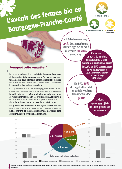 Face à l’enjeu du renouvellement des générations agricoles, Interbio Franche-Comté se mobilise pour accompagner au mieux les agriculteur·rice·s souhaitant transmettre leurs fermes bio. Afin de connaître les potentielles fermes à céder dans les prochaines années et d’en informer les porteurs de projets, mais aussi de comprendre vos besoins et souhaits, nous vous proposons de répondre à un court questionnaire (5 min). Clôture du sondage le 18 mai !